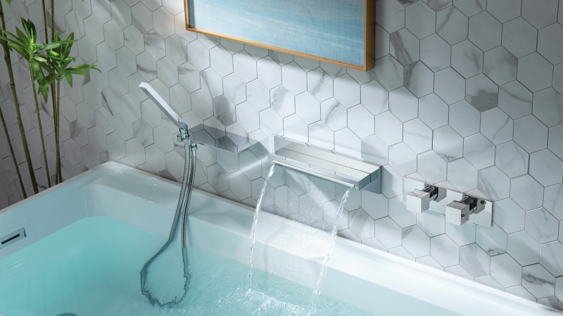 The CFB.2300 installs onto the deck connects via a standard 1/2″ male NPT connection underneath the deck. Available in 24 finishes. Spout Projection – 5.55″ / Width – 9.25″.